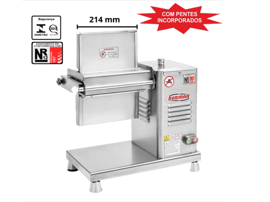 O amaciador BM 115NRPF é confeccionado em aço inoxidável e com pentes amaciadores já integrados. Também conta com proteção fixa, onde os rolos puxam a carne sem que o operador precise colocar a mão no interior equipamento.