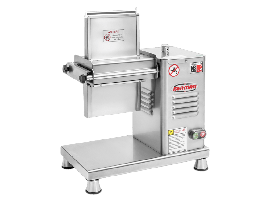 O amaciador BM 34NRPF é confeccionado em aço inoxidável e com os pentes amaciadores já integrados. Também conta com proteção fixa, onde os rolos puxam a carne, sem que o operador precise colocar a mão no interior equipamento.