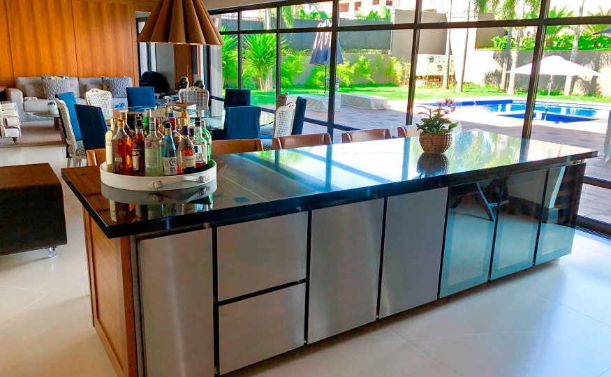 - Revestimento em marcenaria: tendência em projetos modernos, integra o balcão refrigerado ao mobiliário, tornando-se parte da decoração.