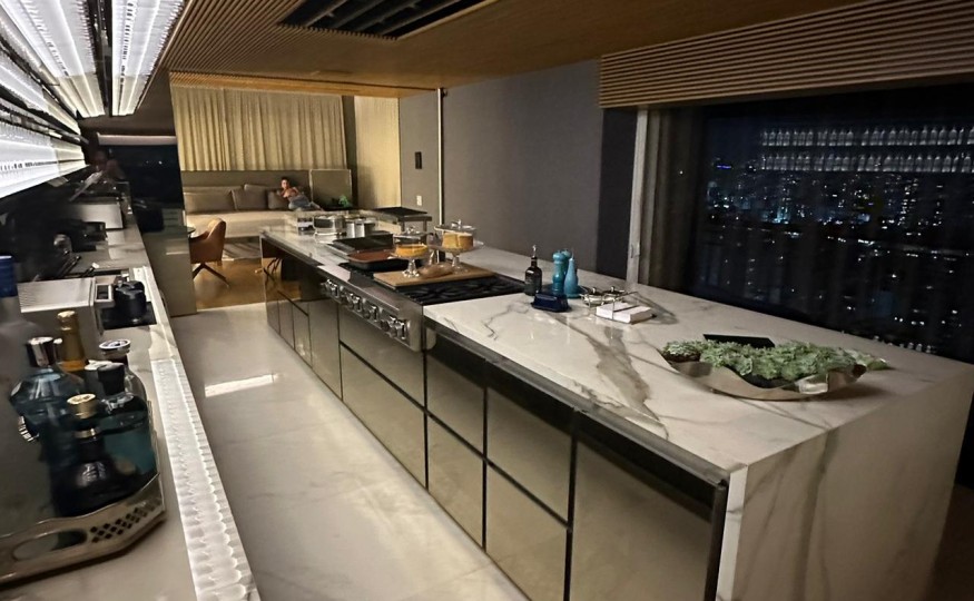Balcão refrigerado projetado para harmonizar com tampo marmorizado, com acabamento em vidro e chopeira embutida. O compartimento para barril completa a experiência gourmet com funcionalidade e sofisticação.