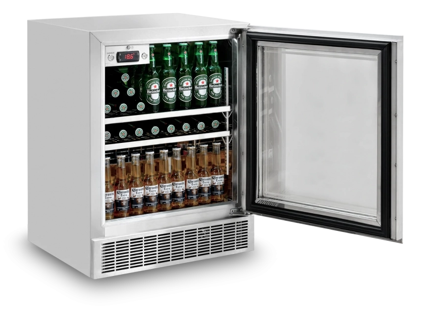 A peça possui portas com bordas em aço Inox 304 escovado ou à revestir, e vidro triplo com tecnologia Low-E, gás argônio entre os vidros e resistência elétrica para garantir o melhor isolamento térmico e diminuir a sudação do vidro, preservando a qualidade das bebidas e dos alimentos.