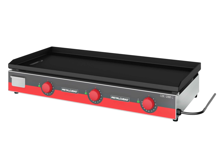 Termostato individual por resistência, chapa superior dobrada em aço SAE 1020 na espessura de 3/16 no modelo CBE 450L, 1/4 nos modelos CBE 600L, CBE 800L, CBE 1000L e CBE 1200L e de 5/16 na CBE 1500L.