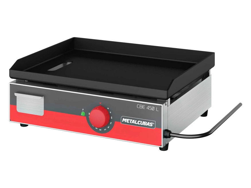 Termostato individual por resistência, chapa superior dobrada em aço SAE 1020 na espessura de 3/16 no modelo CBE 450L, 1/4 nos modelos CBE 600L, CBE 800L, CBE 1000L e CBE 1200L e de 5/16 na CBE 1500L.