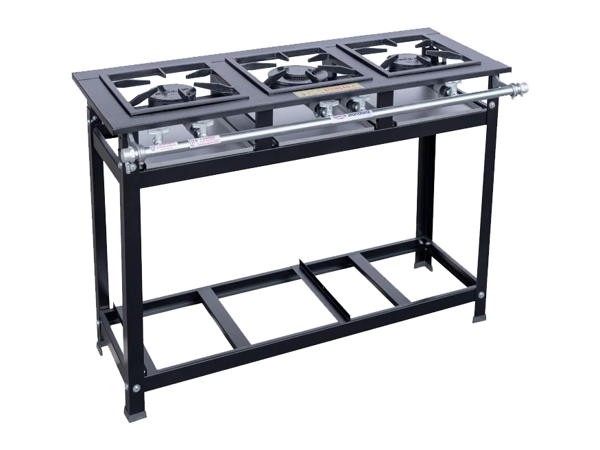a começar com os queimadores feitos completamente de ferro fundido, assim como uma mesa de aço carbono, pintado em preto fosco com material resistente que tanto confere ao equipamento uma estética mais elegante, quanto protege seu material de fenômenos corrosivos.