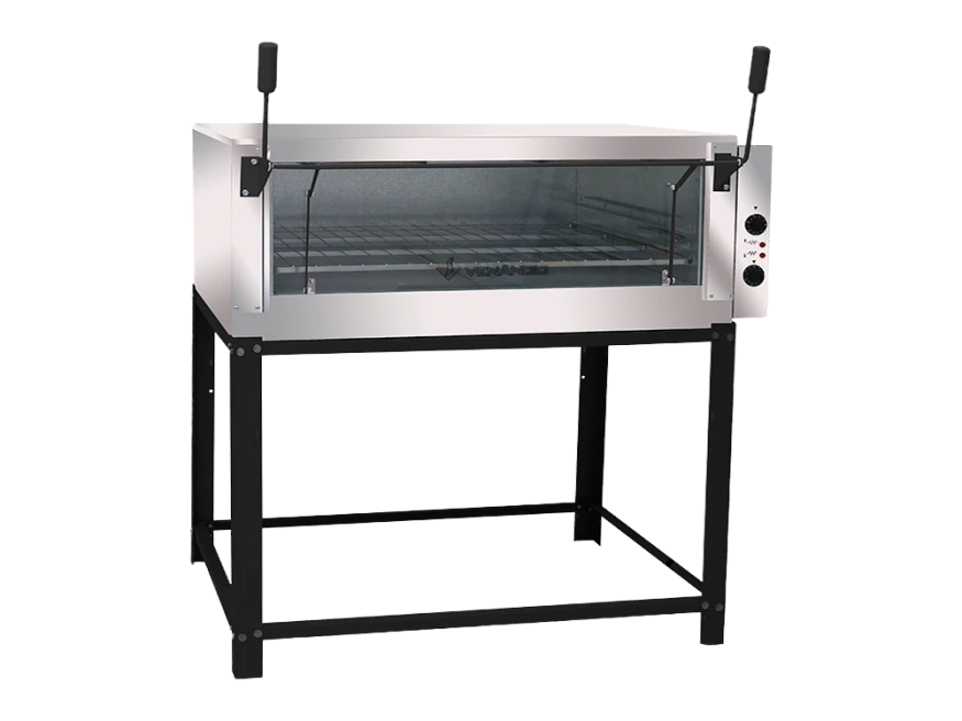 Na parte lateral do forno há um painel composto por dois termostatos de 50°C à 300°C, para regulagem de temperatura, sendo um para a resistência superior e outro para resistência inferior , já na parte interna, a câmara conta com dois trilhos de apoio para regulagem de altura da grelha e também uma bandeja coletora de resíduos em chapa galvanizada super resistente. Este é um equipamento profissional e industrial, feito para você que deseja crescer seu negócio