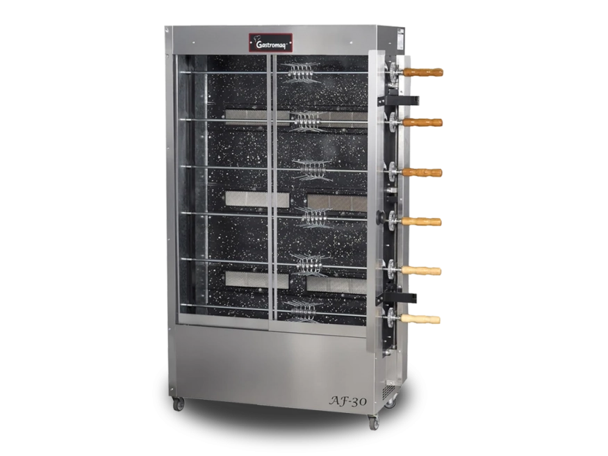 Equipamento para assar frango de maneira fácil e eficiente através de queimadores infravermelhos.
