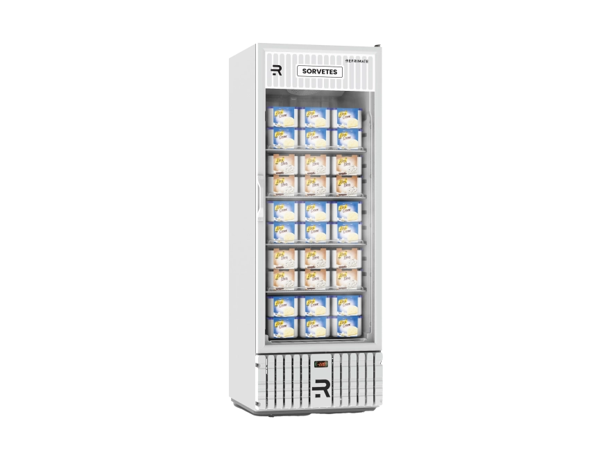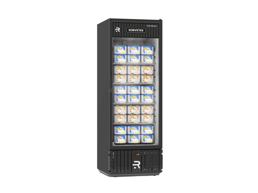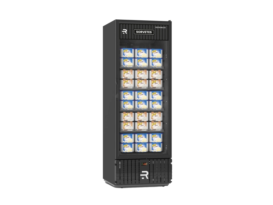 Porta de vidro duplo, temperado com aquecimento. Sistema de abertura pivotante com fechamento automático